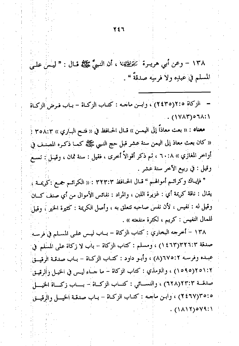 138 - أخرجه البخاري: كتاب الزكاة - باب ليس على المسلم في فرسه صدقة 326: 3 (1463)، ومسلم: كتاب الزكاة - باب لا زكاة على المسلم في عبده وفرسه 2: 675 (8)، وأبو داود: كتاب الزكاة - باب صدقة الرقيق 2: 251 (1595)، والترمذي: كتاب الزكاة - ما جاء ليس في الخيل والرقيق صدقة 3: 23 (628)، والنسائى: كتاب الزكاة - باب زكاة الخيل 5: 35 (2467)، وابن ماجه: كتاب الزكاة - باب صدقة الخيل والرقيق 579: 1 (1812).