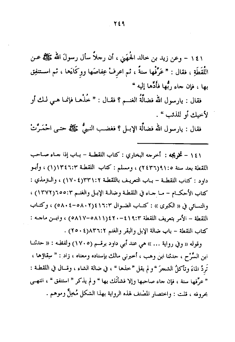 141 - تخريجه: أخرجه البخاري: كتاب اللقطة - باب إذا جاء صاحب اللقطة بعد سنة 5: 91 (2436)، ومسلم: كتاب اللقطة 1346: 3 (1)، وأبو داود: كتاب اللقطة - باب التعريف باللقطة 2: 331 (1704)، والترمذي: كتاب الأحكام - ما جاء فِي اللقطة وضالة الإبل والغنم 3: 655 (1372)، والنسائي فِي "الكبرى": كتاب الضوال 3: 416 (5802 - 5804)، وكتاب اللقطة - الأمر بتعريف اللقطة 419: 3 - 420 (5811 - 5817)، وابن ماجه: كتاب اللقطة - باب ضالة الإبل والبقر والغنم 2: 836 (2504).