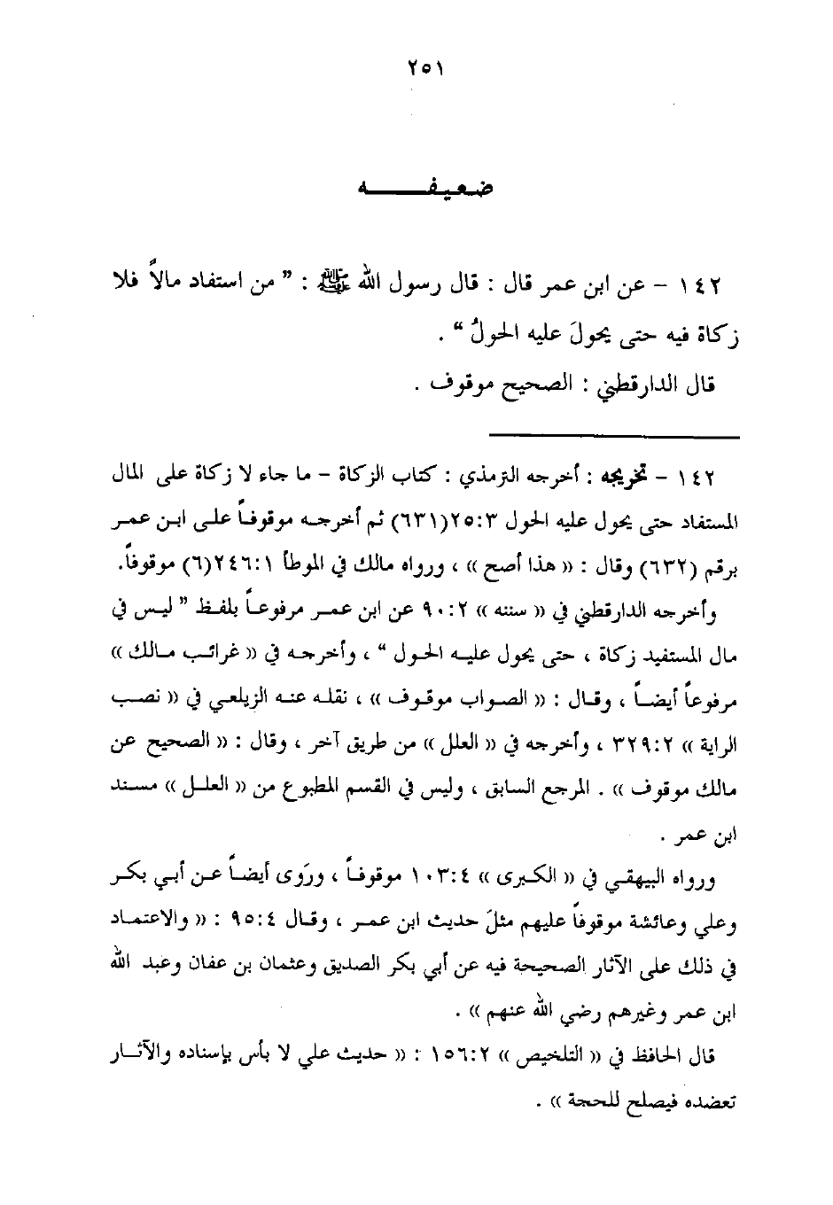 142 - تخريجه: أخرجه الترمذي: كتاب الزكاة - ما جاء لا زكاة على المال المسنفاد حتَّى يحول عليه الحول 3: 25 (631) ثم أخرجه موقوفًا على ابن عمر برقم (632) وقال: "هذا أصح"، ورواه مالك فِي الموطأ 1: 246 (6) موقوفًا.