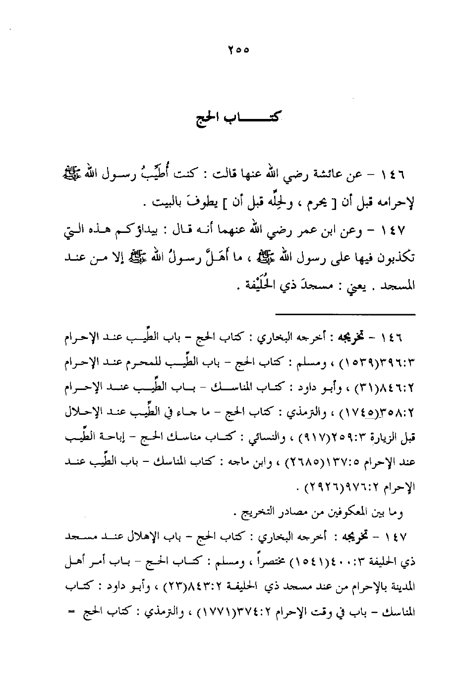 146 - تخريجه: أخرجه البخاري: كتاب الحج - باب الطِّيب عند الإحرام 396: 3 (1539)، ومسلم: كتاب الحج - باب الطِّيب للمحرم عند الإحرام 846: 2 (31)، وأبو داود: كتاب المناسك - باب الطِّيب عند الإحرام 358: 2 (1745)، والترمذي: كتاب الحج - ما جاء فِي الطِّيب عند الإحلال قبل الزيارة 3: 259 (917)، والنسائي: كتاب مناسك الحج - إباحة الطِّيب عند الإحرام 137: 5 (2685)، وابن ماجه: كتاب المناسك - باب الطِّيِب عند الإحرام 2: 976 (2926).