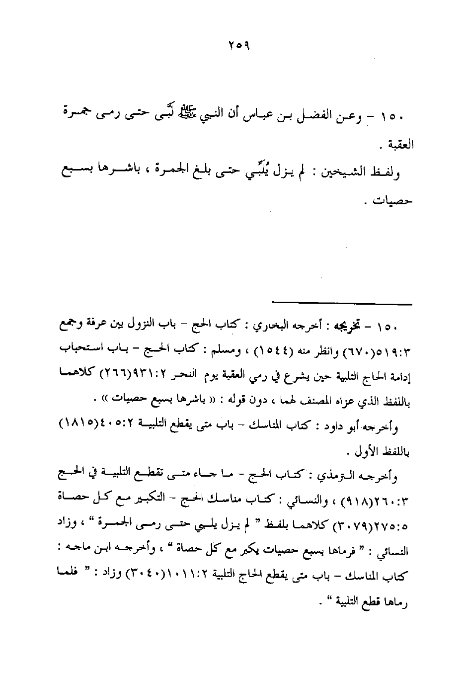 150 - وعن الفضل بن عباس أن النبي - صلى الله عليه وسلم - لَبَّى حتَّى رمى جمرة العقبة.