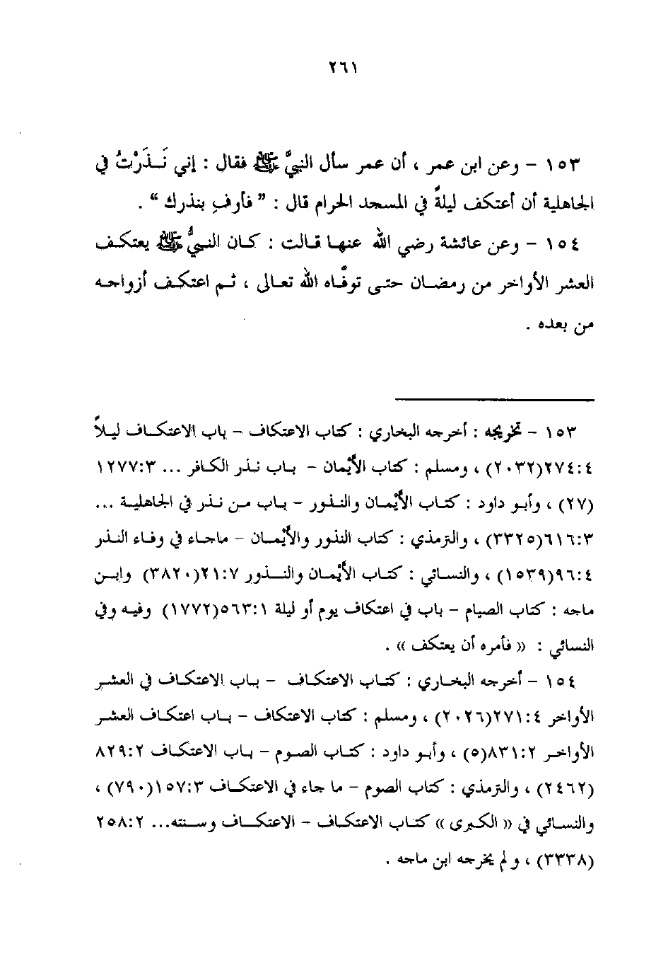 153 - تخريجه: أخرجه البخاري: كتاب الاعتكاف - باب الاعتكاف ليلًا 4: 274 (2032)، ومسلم: كتاب الأيمان - باب نذر الكافر ... 3: 1277 (27)، وأبو داود: كتاب الأيمان والنذور - باب من نذر فِي الجاهلية ... 3: 616 (3325)، والترمذى: كتاب النذور والأَيْمان - ما جاء فِي وفاء النذر 4: 96 (1539)، والنسائي: كتاب الأيمان والنذور 7: 21 (3820) وابن ماجه: كتاب الصيام - باب فِي اعتكاف يوم أو ليلة 1: 563 (1772) وفيه وفي النسائي: "فأمره أن يعتكف".