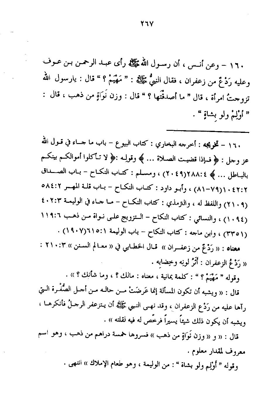 160 - وعن أنس، أن رسول الله - صلى الله عليه وسلم - رأى عبد الرحمن بن عوف وعليه رَدْعٌ من زعفران، فقال النبيُّ - صلى الله عليه وسلم -: "مَهْيَمْ" قال: يا رسول الله تزوجتُ امرأة، قال "ما أصدقْتَها؟ " قال: وزن نَوَاةٍ من ذهب، قال: "أوْلِمْ ولو بِشاةٍ".