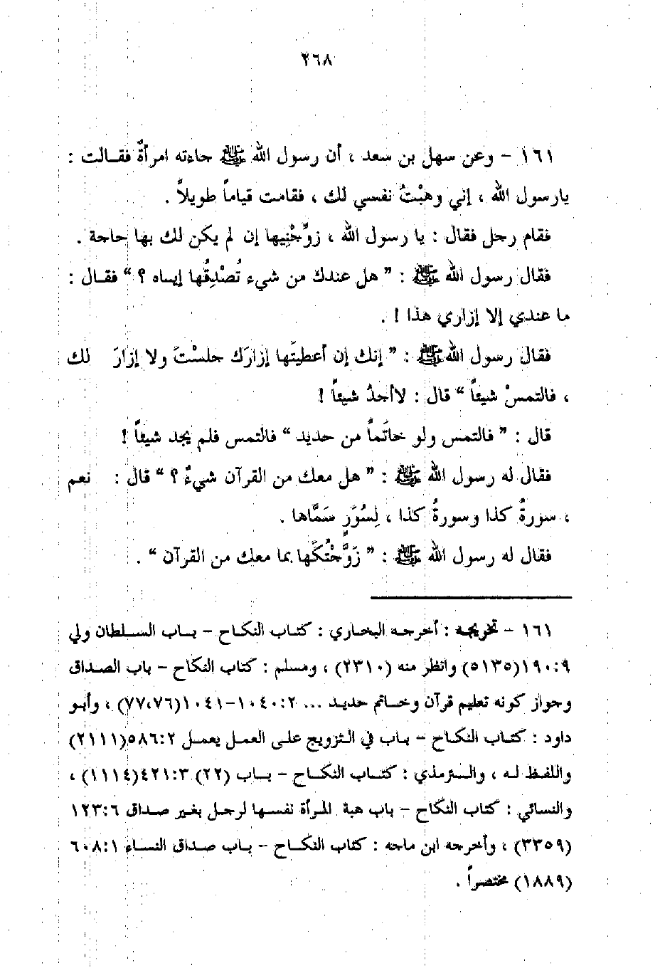 161 - تخريجه: أخرجه البخاري: كتاب النكاح - باب السلطان ولي 9: 190 (5135) وانظر منه (2310)، ومسلم: كتاب النكاح - باب الصداق وجواز كونه تعليم قرآن وخاتم حديد ... 2: 1040 - 1041 (77، 76)، وأبو داود: كتاب النكاح - باب في التزويج على العمل يعمل 586: 2 (2111) واللفظ له، والترمذي: كتاب النكاح - باب (22) 3: 421 (1114)، والنسائي: كتاب النكاح - باب هبة المرأة نفسها لرجل بغير صداق 123: 6 (3359)، وأخرجه ابن ماجه: كتاب النكاح - باب صداق النساء 1: 608 (1889) مختصرًا.