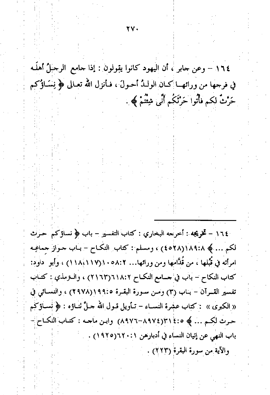 164 - تخريجه: أخرجه البخاري: كتاب التفسير - باب {نِسَاؤُكُمْ حَرْثٌ لَكُمْ ...} 189: 8 (4528)، ومسلم: كتاب النكاح - باب جواز جِماعِه امرأته في قُبُلها، من قُدَّامها ومن ورائها ... 1058: 2 (118، 117)، وأبو داود: كتاب النكاح - باب في جامع النكاح 2: 618 (2163)، والترمذي: كتاب تفسير القرآن - باب (3) ومن سورة البقرة 5: 199 (2978)، والنسائي في "الكبرى": كتاب عشرة النساء - تأويل قول الله جلَّ ثناؤه: {نِسَاؤُكُمْ حَرْثٌ لَكُمْ ...} 5: 314 (8974 - 8976) وابن ماجه: كتاب النكاح - باب النهي عن إتيان النساء في أدبارهن 1: 620 (1925).