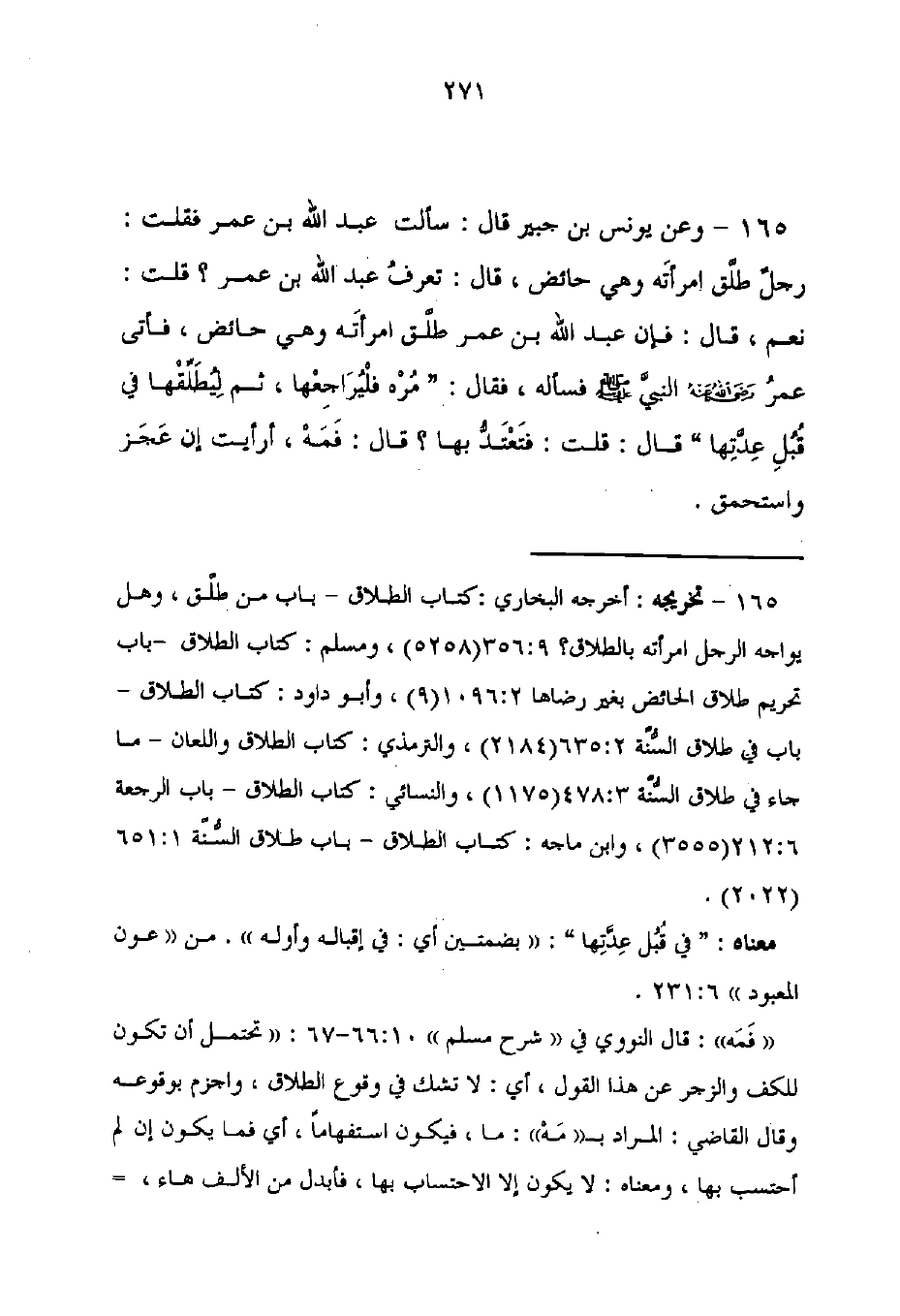 165 - تخريجه: أخرجه البخاري: كتاب الطلاق - باب من طلَّق، وهل يواجه الرجل امرأته بالطلاق؟ 9: 356 (5258)، ومسلم: كتاب الطلاق - باب تحريم طلاق الحائض بغير رضاها 2: 1096 (9)، وأبو داود: كتاب الطلاق - باب في طلاق السُّنَّة 2: 635 (2184)، والترمذي: كتاب الطلاق واللعان - ما جاء في طلاق السُّنَّة 478: 3 (1175)، والنسائي: كتاب الطلاق - باب الرجعة 6: 212 (3555)، وابن ماجه: كتاب الطلاق - باب طلاق السُّنَّة 1: 651 (2022).