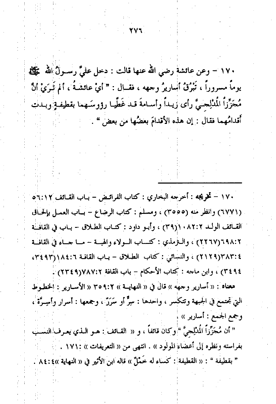 170 - وعن عائشة رضي الله عنها قالت: دخل عليَّ رسولُ الله - صلى الله عليه وسلم - يومًا مسرورًا، تَبْرُقُ أساريرُ وجهه، فقال: "أي عائشة، ألم تَرَيْ أنَّ مُجَزِّزًا المُدْلِجِيَّ رأى زيدًا وأسامةَ قد غَطَّيا رؤوسَهما بقطيفةٍ وبدت أَقدامُهما فقال: إن هذه الأقدامَ بعضُها من بعض".