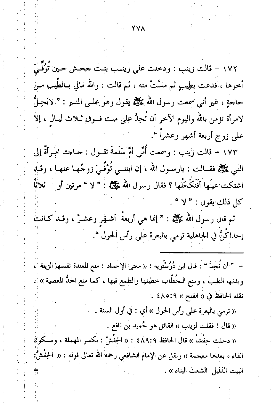 172 - قالت زينب: ودخلت على زينب بنت جحش حين تُوُفِّيَ أخوها، فدعت بِطِيبٍ ثم مسَّتْ منه، ثم قالت: والله مالي بالطِّيبِ من حاجةٍ، غير أني سمعت رسول الله - صلى الله عليه وسلم - يقول وهو على المنير: "لا يَحِلُّ لامرأة تؤمن بالله واليرم الآخر أن تُحِدَّ على ميت فوق ثلاث ليالٍ، إلا على زوج أربعة أشهر وعشرًا".