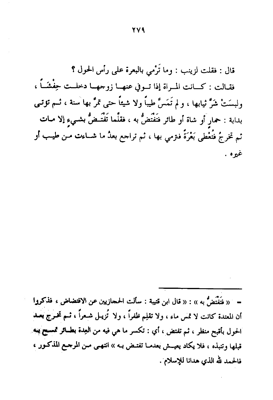 فقالت: كانت المرأة إذا توفي عنها زوجها دخلت حِفْشًا، ولبسَتْ شَرَّ ثيابها، ولم تَمَسَّ طيبًا ولا شيئًا حتى تمرَّ بها سنة، ثم تؤتى بدابة: حمارٍ أو شاة أو طائر فتَفْتَضُّ به، فقلَّما تَفْتَضُّ بشئٍ إلا مات ثم تخرجُ فتُعْطى بَعْرَةً فترمي بها، ثم تراجع بعدُ ما شاءت من طيب أو غيره.
