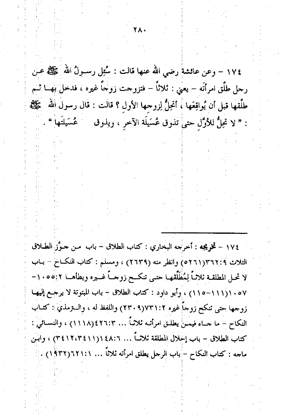 174 - تخريجه: أخرجه البخاري: كتاب الطلاق - باب من جوَّز الطلاق الثلاث 9: 362 (5261) وانظر منه (2639)، ومسلم: كتاب النكاح - باب لا تحل المطلقة ثلاثًا لِمطَلِّقها حتى تنكح زوجًا غيره ويطأها 2: 1055 - 1057 (111 - 115)، وأبو داود: كتاب الطلاق - باب المبتوتة لا يرجع إليها زوجها حتى تنكح زوجًا غيره 2: 731 (2309) واللفظ له، والترمذى: كتاب النكاح - ما جاء فيمن يطلق امرأته ثلاثًا ... 426: 3 (1118)، والنسائي: كتاب الطلاق - باب إحلال المطلقة ثلاثًا ... 6: 148 (3411، 3412)، وابن ماجه: كتاب النكاح - باب الرجل يطلق امرأته ثلاثًا ... 1: 621 (1932).