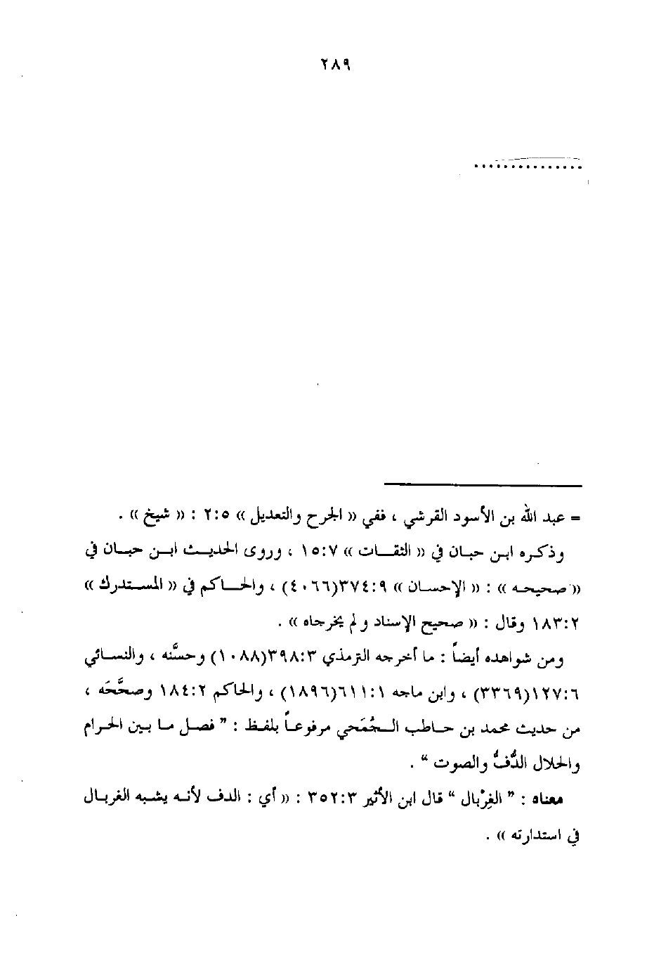 ومن شواهده أيضًا: ما أخرجه الترمذي 398: 3 (1088) وحسُّنه، والنسائي 127: 6 (3369)، وابن ماجه 1: 611 (1896)، والحاكم 184: 2 وصحَّحَه، من حديث محمد بن حاطب الجُمَحي مرفوعًا بلفظ: "فصل ما بين الحرام والحلال الدُّفُّ والصوت".