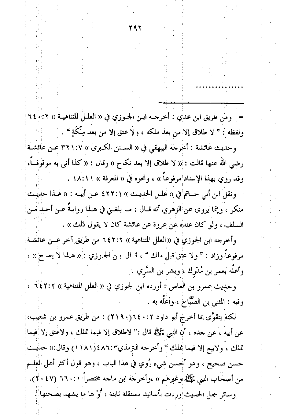 = ومن طريق ابن عدي: أخرجه اين الجوزي في "العلل المتناهية" 2: 640 ولفظه: "لا طلاق إلا من بعد ملكه، ولا عتق إلا من بعد مِلْكَةٍ".