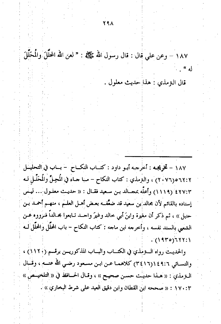 187 - تخريجه: أخرجه أبو داود: كتاب النكاح - باب في التحليل 2: 562 (2076)، والترمذى: كتاب النكاح - ما جاء في المُحِلِّ والمُحَلَّلِ له 427: 3 (1119) وأعله بمجالد بن سعيد فقال: "حديث معلول ... ليس إسناده بالقائم لأن مجالد بن سعيد قد ضعَّفه بعض أهل العلم، منهم أحمد بن حنبل"، ثم ذكر أن مغيرة وابنَ أبي خالد وغيرَ واحد تابعوا مجالدًا فرووه عن الشعبي بالسند نفسه، وأخرجه ابن ماجه: كتاب النكاح - باب المحلِّل والمحلَّل له 1: 622 (1935).