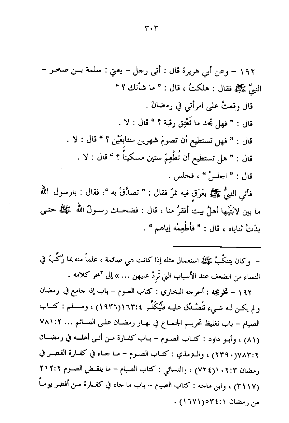 192 - تخريجه: أخرجه البخارى: كتاب الصوم - باب إذا جامع في رمضان ولم يكن له شيء فتُصُدِّق عليه فلْيُكَفِّر 4: 163 (1936)، ومسلم: كتاب الصيام - باب تغليظ تحريم الجماع في نهار رمضان على الصائم ... 2: 781 (81)، وأبو داود: كتاب الصوم - باب كفارة من أتى أهله في رمضان 783: 2 (2390)، والترمذى: كتاب الصوم - ما جاء في كفارة الفطر في رمضان 3: 102 (724)، والنسائى: كتاب الصيام - ما ينقض الصوم 2: 212 (3117)، وابن ماجه: كتاب الصيام - باب ما جاء في كفارة من أفطر يومًا من رمضان 1: 534 (1671).