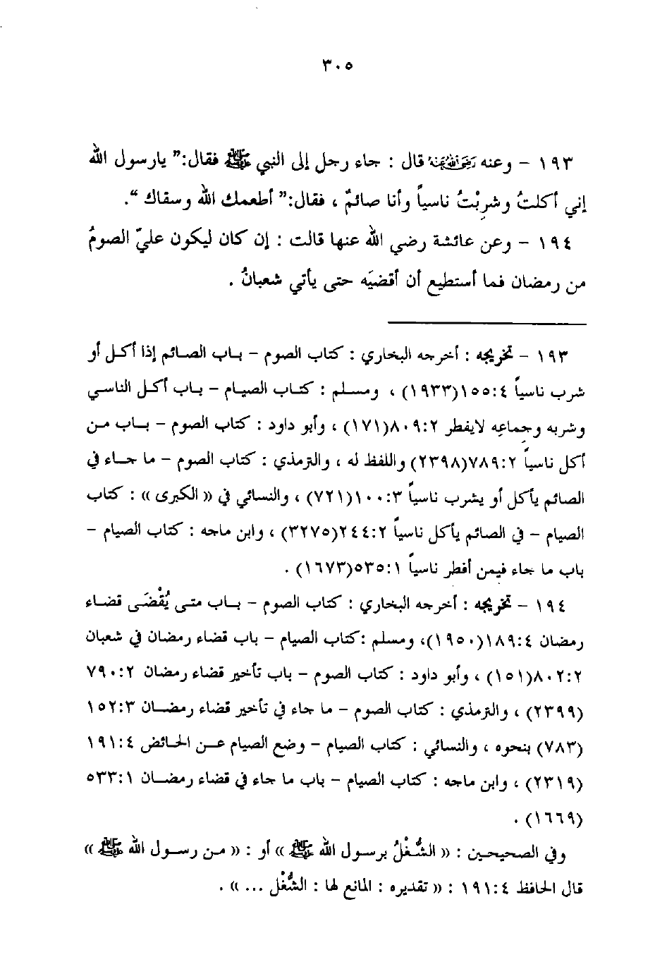 193 - وعنه - رضي الله عنه - قال: جاء رجل إلى النبي - رضي الله عنه - فقال: "يا رسول الله إني أكلتُ وشرِبْتُ ناسيًا وأنا صائمٌ، فقال: "أطعمك الله وسقاك".