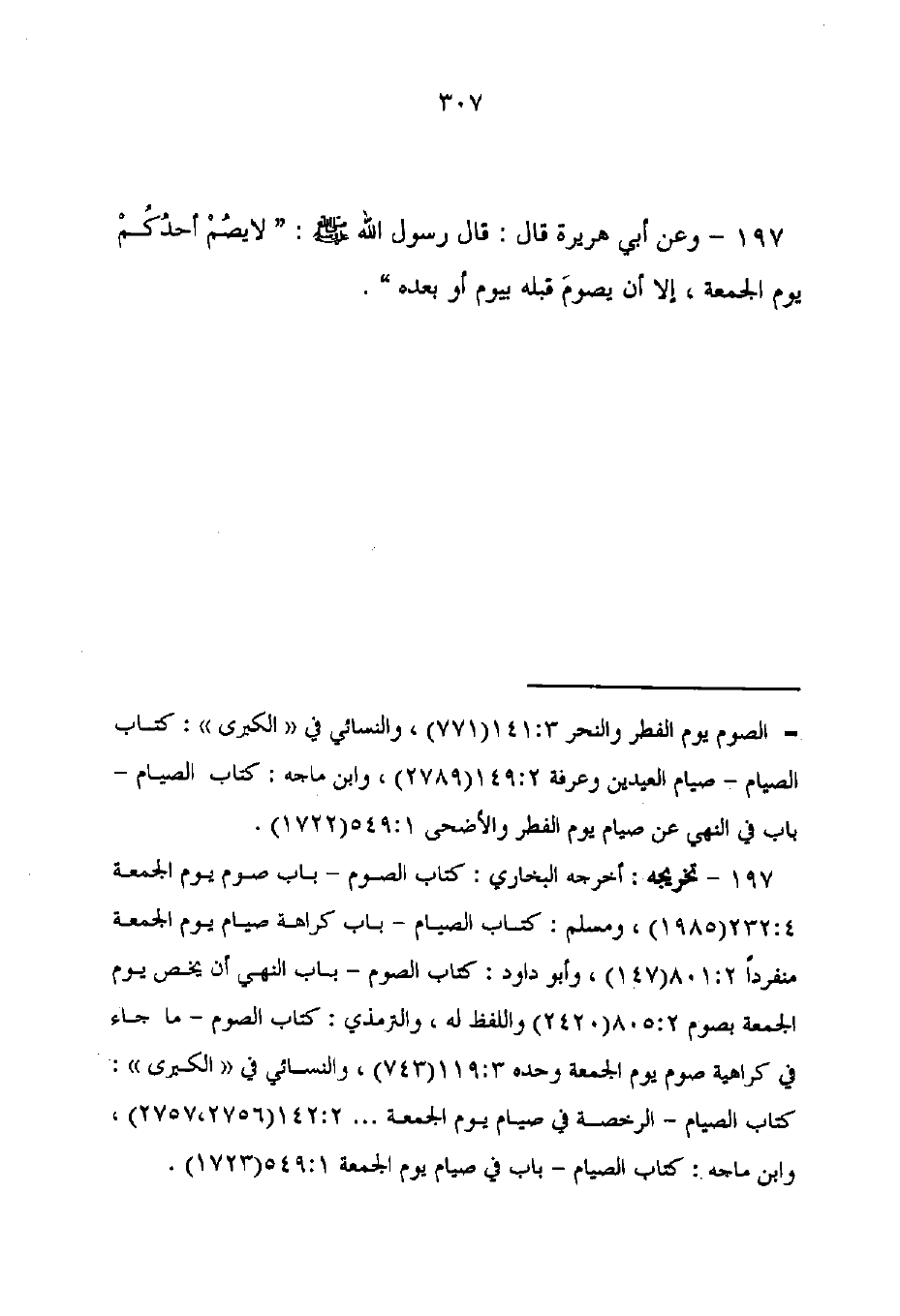 197 - تخريجه: أخرجه البخارى: كتاب الصوم - باب صوم يوم الجمعة 4: 232 (1985)، ومسلم: كتاب الصيام - باب كراهة صيام يوم الجمعة منفردًا 2: 801 (147)، وأبو داود: كتاب الصوم - باب النهي أن يخص يوم الجمعه بصوم 2: 805 (2420) واللفظ له، والترمذي: كتاب الصوم - ما جاء في كراهية صوم يوم الجمعة وحده 3: 119 (743)، والنسائي في "الكبرى": كتاب الصيام - الرخصة في صيام يوم الجمعة ... 2: 142 (2757، 2756)، وابن ماجه: كتاب الصيام - باب في صيام يوم الجمعة 1: 549 (1723).