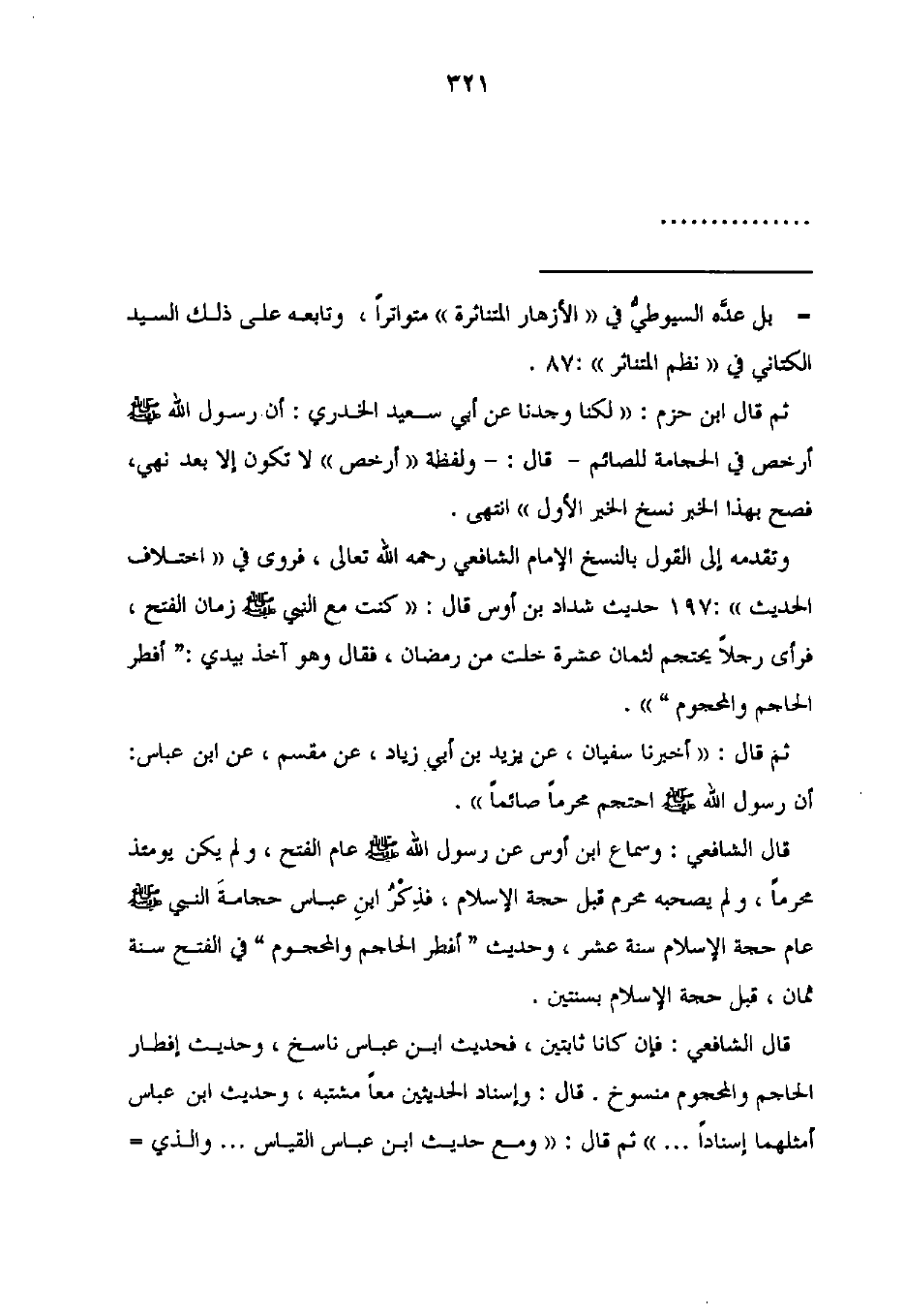 قال الشافعي: وسماع ابن أوس عن رسول الله - صلى الله عليه وسلم - عام الفتح، ولم يكن يومئذ محرمًا، ولم يصحبه محرم قبل حجة الإسلام، فذِكْرُ ابنِ عباس حجامةَ النبي - صلى الله عليه وسلم - عام حجة الإسلام سنة عشر، وحديث "أفطر الحاجم والمحجوم" في الفتح سنة ثمان، قبل حجة الإسلام بسنتين.