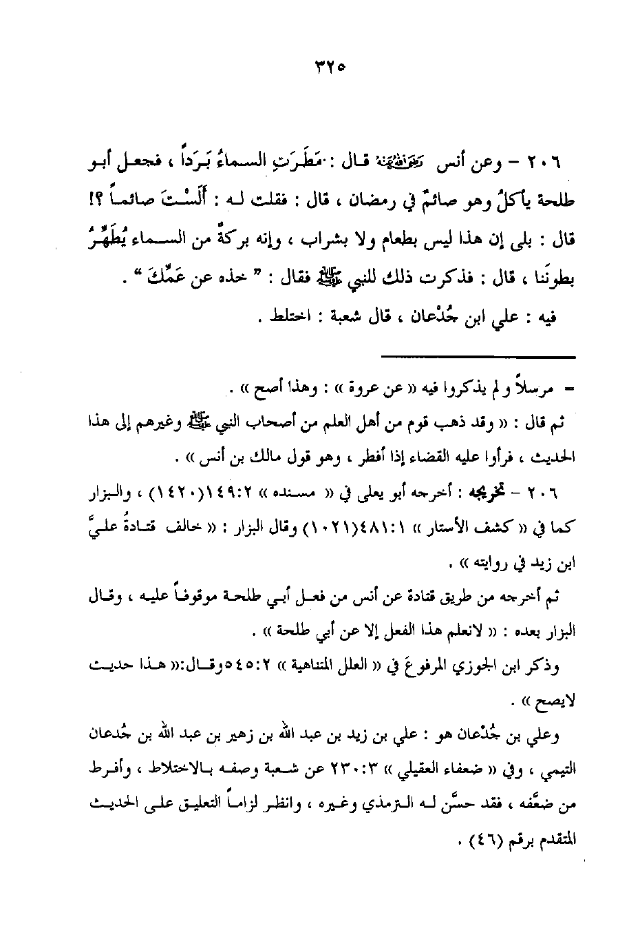 206 - وعن أنس - رضي الله عنه - قال: مَطَرَتِ السماءُ بَرَدًا، فجعل أبو طلحة يأكلُ وهو صائمٌ في رمضان، قال: فقلت له: ألَسْتَ صائمًا؟! قال: بلى إن هذا ليس بطعام ولا بشراب، وإنه بركةٌ من السماء يُطَهِّرُ بطونَنا، قال: فذكرت ذلك للنبي - صلى الله عليه وسلم - فقال: "خذه عن عَمِّكَ". فيه: علي ابن جُدْعان، قال شعبة: اختلط.