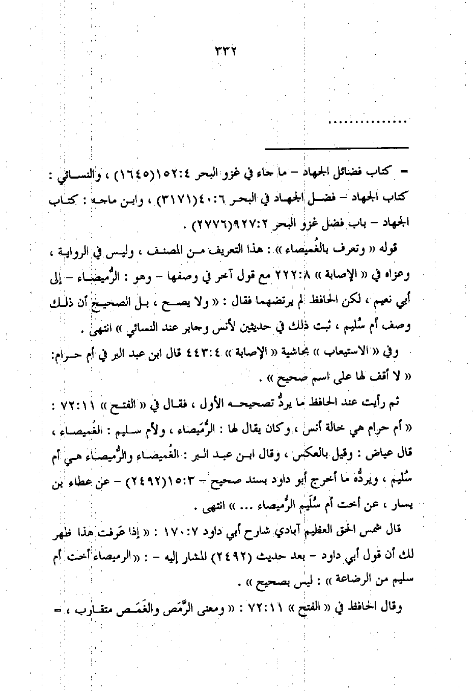 ثم رأيت عند الحافظ ما يردُّ تصحيحه الأول، فقال في "الفتح" 72: 11: "أم حرام هي خالة أنس، وكان يقال لها: الرُّمَيصاء، ولأم سليم: الغُميصاء، قال عياض: وقيل بالعكس، وقال ابن عبد البر: الغُميصاء والرُّميصاء هي أم سُليم، ويردُّه ما أخرج أبو داود بسند صحيح - 3: 15 (2492) - عن عطاء بن يسار، عن أخت أم سُلَيم الرُّميصاء. . . ." انتهى.