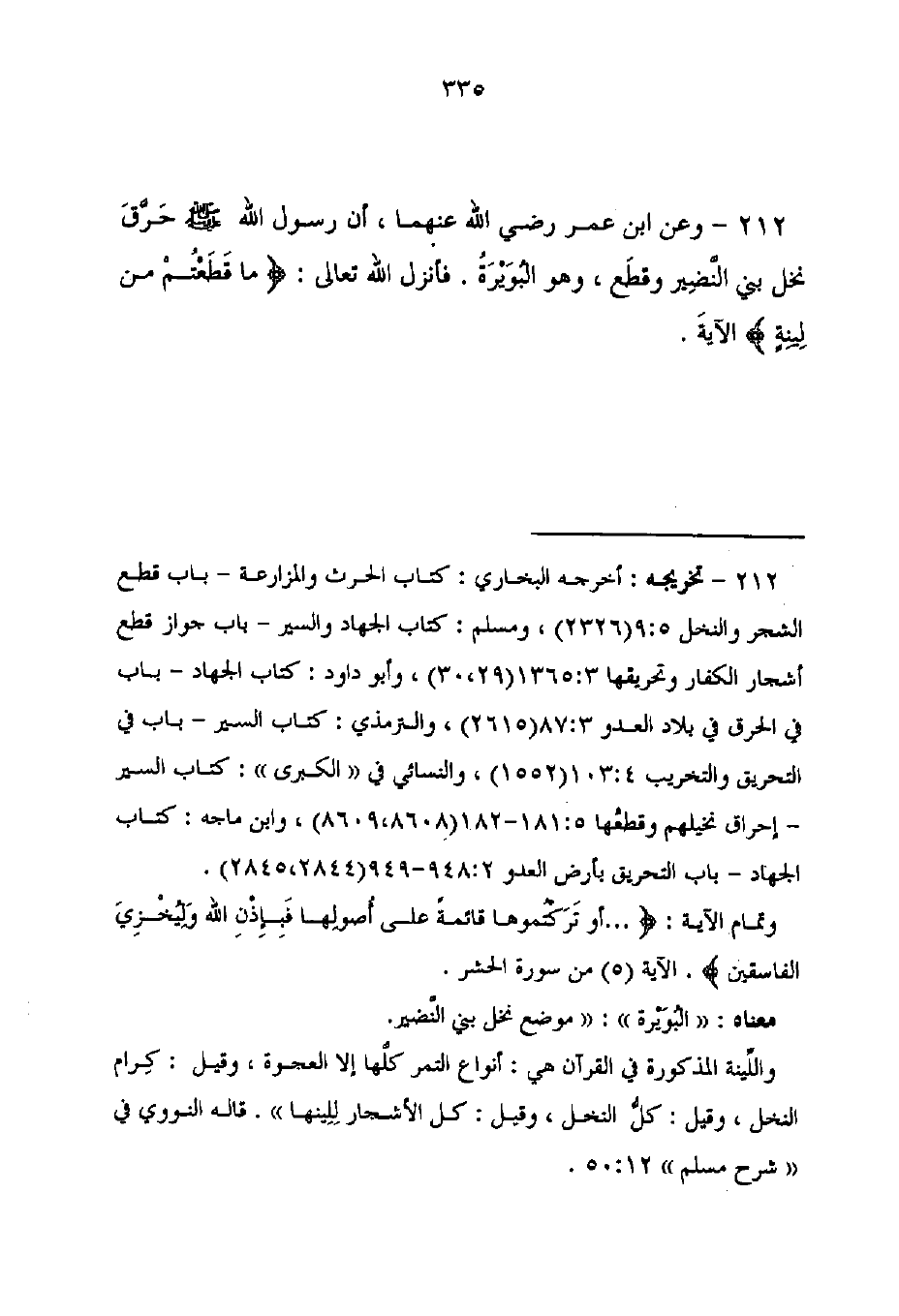 212 - وعن ابن عمر رضي الله عنهما، أن رسول الله - صلى الله عليه وسلم - حَرَّقَ نخل بني النَّضِير وقطَع، وهو البُوَيْرَةُ. فأنزل الله تعالى: {مَا قَطَعْتُمْ مِنْ لِينَةٍ} الآيةَ.