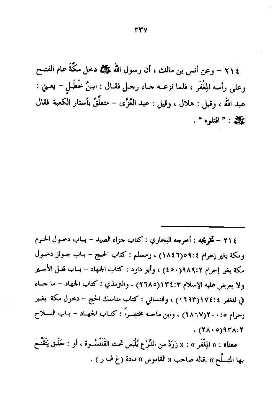 214 - تخريجه: أخرجه البخاري: كتاب جزاء الصيد - باب دخول الحرم ومكة بغير إحرام 4: 59 (1846)، ومسلم: كتاب الحج - باب جواز دخول مكة بغير إحرام 2: 989 (450)، وأبو داود: كتاب الجهاد - باب قتل الأسير ولا يعرض عليه الإسلام 3: 134 (2685)، والترمذي: كتاب الجهاد - ما جاء في المغفر 4: 174 (1693)، والنسائي: كتاب مناسك الحج - دخول مكة بغير إحرام 5: 200 (2867)، وابن ماجه مختصرًا: كتاب الجهاد - باب السلاح 938: 2 (2805).