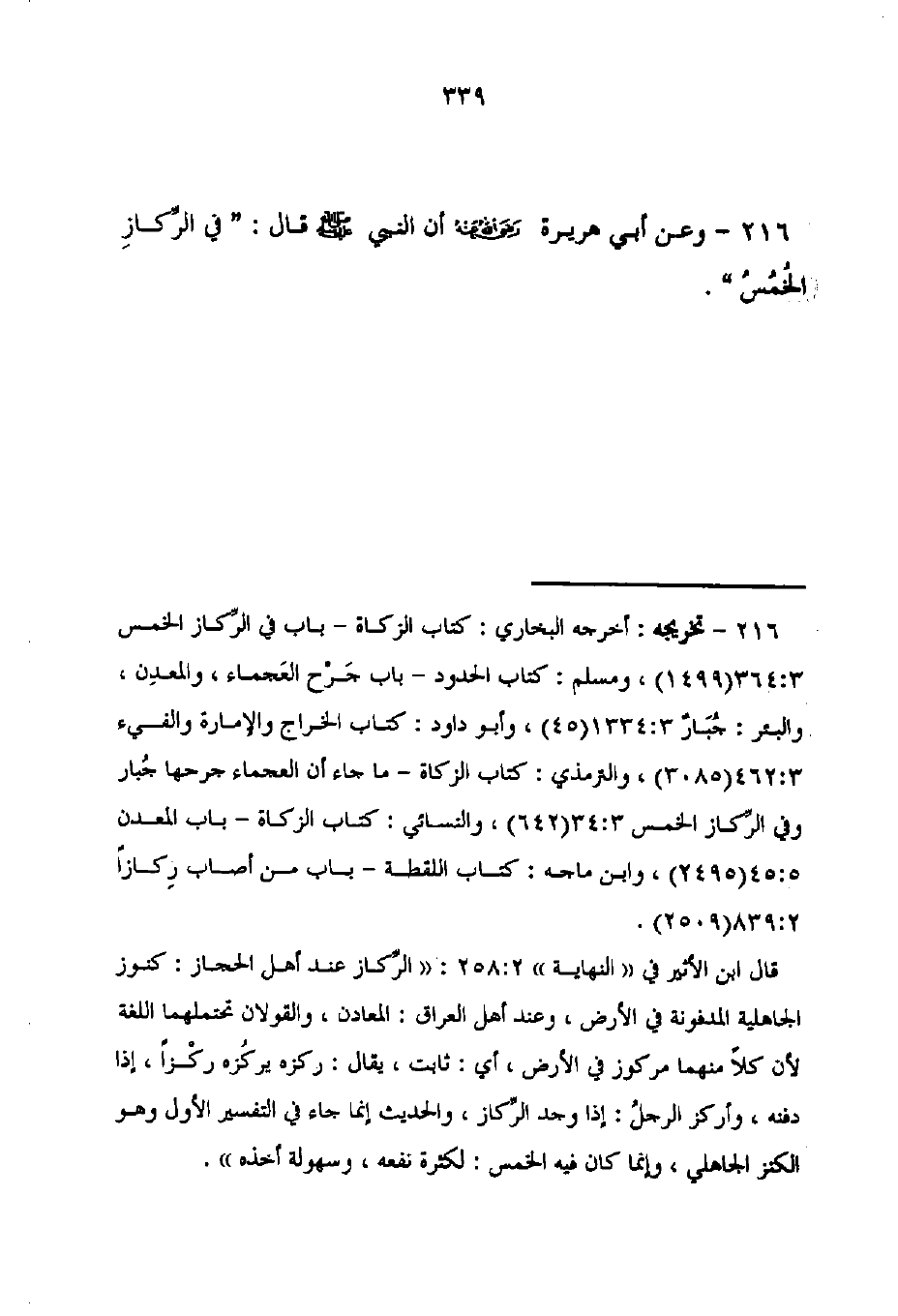 216 - تخريجه: أخرجه البخارى: كتاب الزكاة - باب في الرِّكاز الخمس 3: 364 (1499)، ومسلم: كتاب الحدود - باب جَرْح العَجماء، والمعدِن، والبئر: جُبَارٌ 3: 1334 (45)، وأبو داود: كتاب الخراج والإمارة والفيء 3: 462 (3085)، والترمذي: كتاب الزكاة - ما جاء أن العجماء جرحها جُبار وفي الرِّكاز الخمس 3: 34 (642)، والنسائى: كتاب الزكاة - باب المعدن 5: 45 (2495)، وابن ماجه: كتاب اللقطة- باب من أصاب رِكازًا 839: 2 (2509).