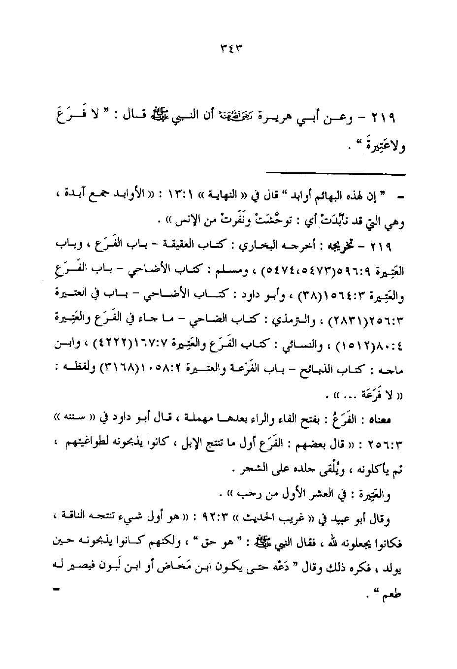 219 - تخريجه: أخرجه البخارى: كتاب العقيقة - باب الفَرَع، وباب العَتِيرة 9: 596 (5473، 5474)، ومسلم: كتاب الأضاحي - باب الفَرَع والعَتِيرة 3: 1564 (38)، وأبو داود: باب الأضاحي - باب في العَتِيرة 256: 3 (2831)، والترمذي: كتاب الضاحي - ما جاء في الفَرَع والعَتِيرة 4: 80 (1512)، والنسائي: كتاب الفَرَع والعَتِيرة 167: 7 (4222)، وابن ماجه: كتاب الذبائح - باب الفَرَعة والعتيرة 2: 1058 (3168) ولفظه: "لا فَرَعَة. . . .".