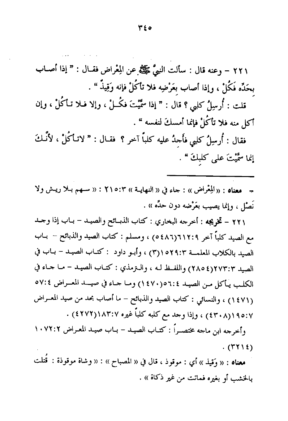 221 - وعنه قال: سألت النبيَّ - صلى الله عليه وسلم - عن المِعْراض فقال: "إذا أصاب بِحَدِّه فَكُلْ، وإذا أصاب بِعَرْضِه فلا تأكُلْ فإنه وَقِيذٌ".