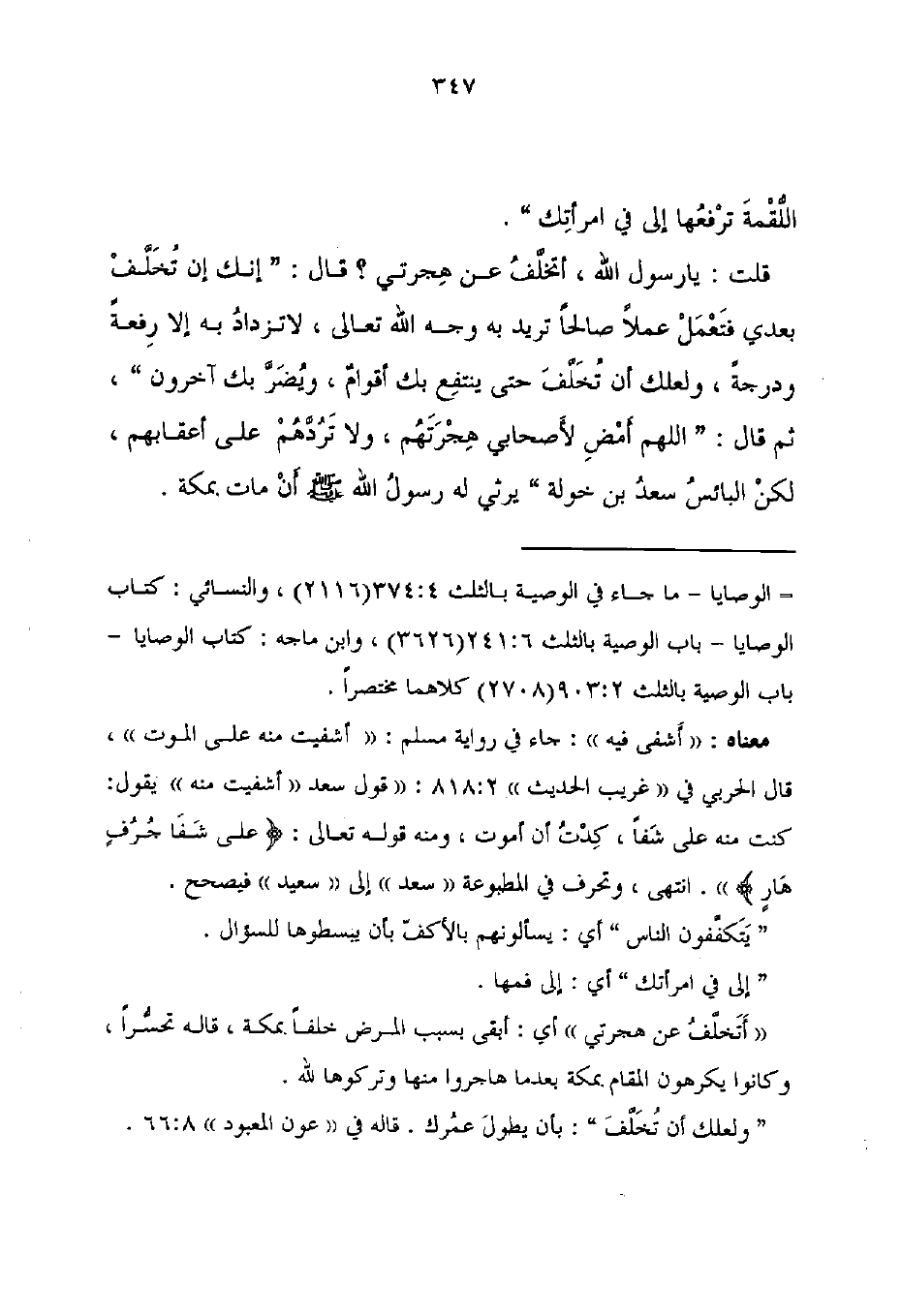 قلت: يا رسول الله، أتخلَّفُ عن هِجرتي؟ قال: "إنك إن تُخَلَّفْ بعدي فتَعْمَلْ عملًا صالحًا تريد به وجه الله تعالى، لا تزدادُ به إلا رِفعةً ودرجةً، ولعلك أن تُخَلَّفَ حتى ينتفِع بك أقوامٌ، ويُضَرَّ بك آخرون"، ثم قال: "اللهم أمْضِ لأَصحابي هِجْرَتَهُم، ولا تَرُدَّهُمْ على أعقابهم، لكنْ البائسُ سعدُ بن خولة" يرثى له رسولُ الله - صلى الله عليه وسلم - أنْ مات بمكة.