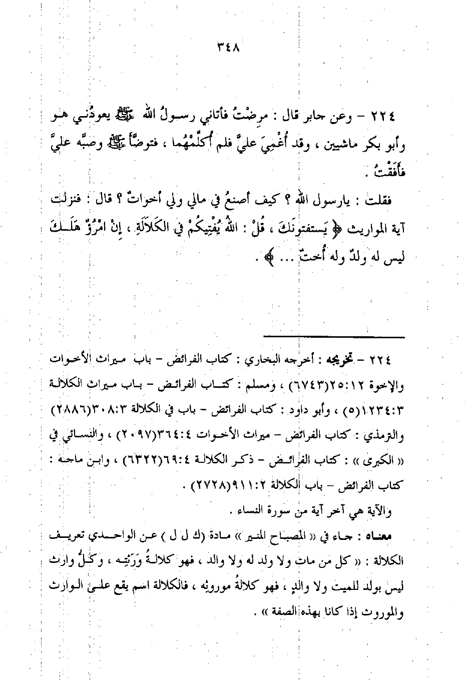 224 - تخريجه: أخرجه البخارى: كتاب الفرائض - باب ميراث الأخوات والإخوة 12: 25 (6743)، ومسلم: كتاب الفرائض - باب ميراث الكلالة 3: 1234 (5)، وأبو داود: كتاب الفرائض - باب في الكلالة 308: 3 (2886) والترمذي: كتاب الفرائض - ميراث الأخوات 4: 364 (2097)، والنسائي في "الكبرى": كتاب الفرائض - ذكر الكلالة 4: 69 (6322)، وابن ماجه: كتاب الفرائض - باب الكلالة 2: 911 (2728).
