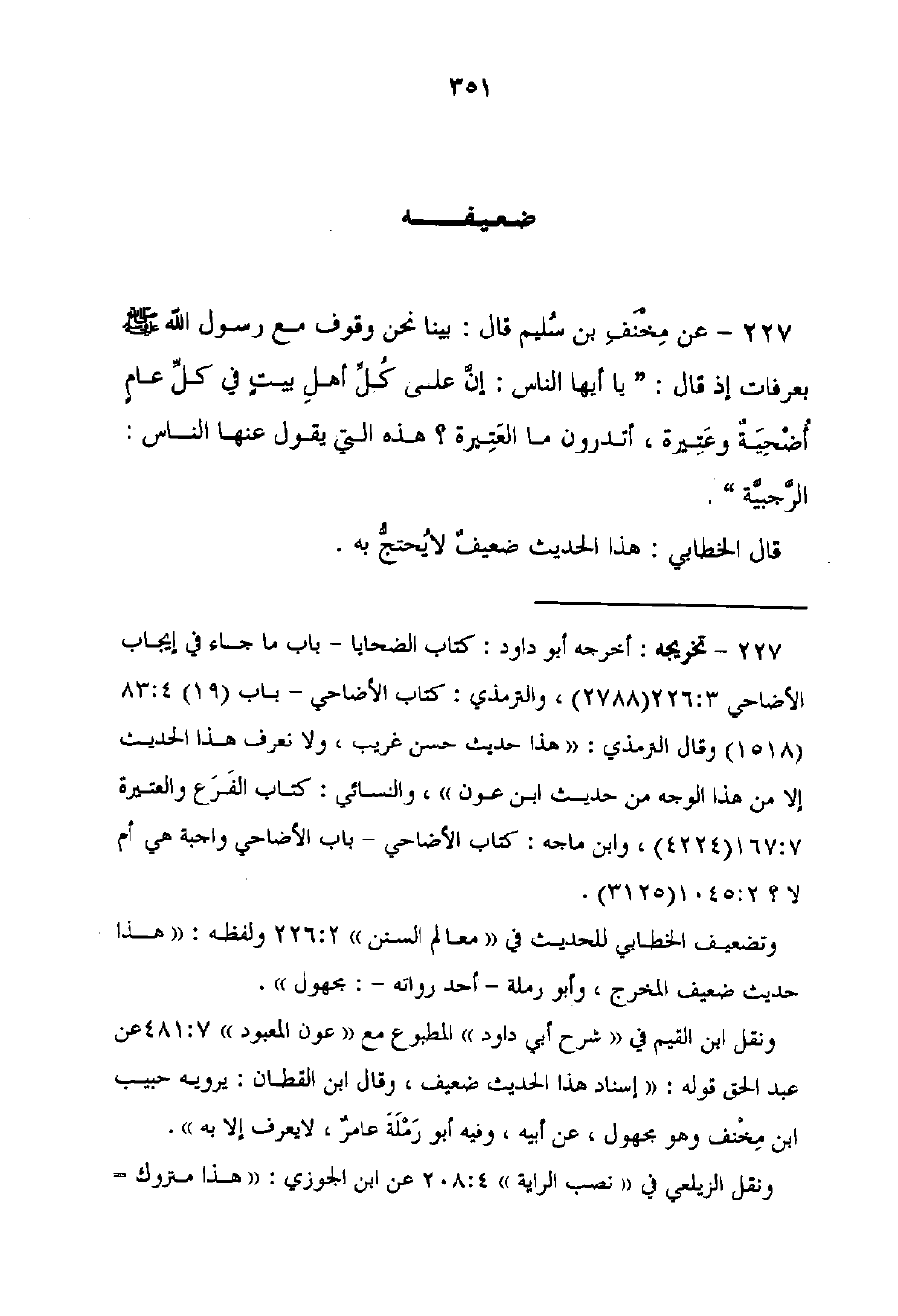 227 - عن مِخْنفِ بن سُليم قال: بينا نحن وقوف مع رسول الله - صلى الله عليه وسلم - بعرفات إذ قال: "يا أيها الناس: إن على كلِّ أهلِ بيتِ في كلِّ عامٍ أُضْحِيَةٌ وعَتِيرة، أتدرون ما العَتِيرة؟ هذه التي يقول عنها الناس: الرَّجبيَّة".