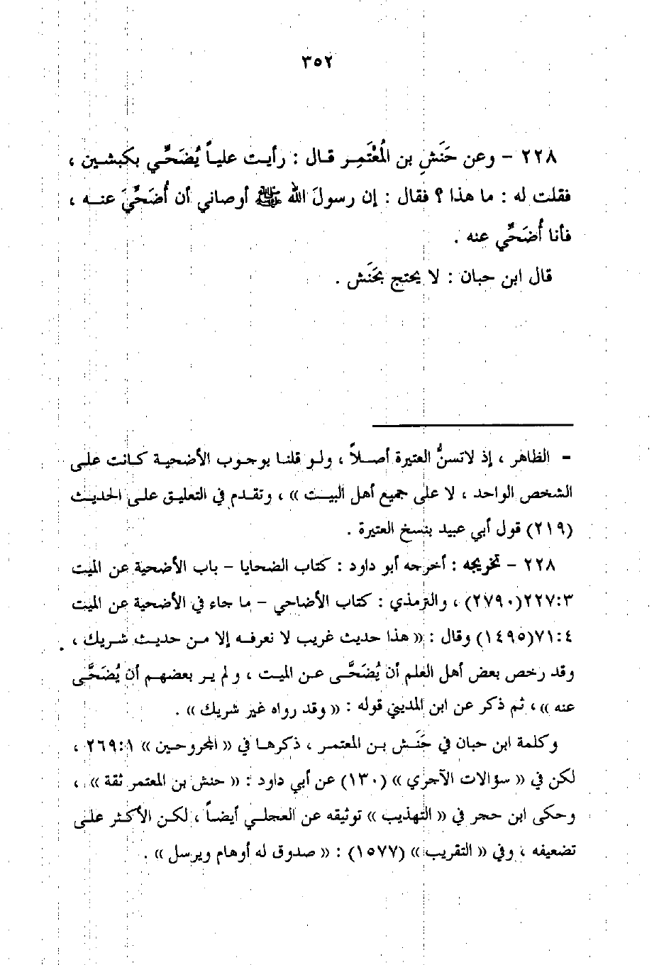 228 - وعن حَنَش بن المُعتَمِر قال: رأيت عليًا يُضَحِّي بكبشين، فقلت له: ما هذا؟ فقال: إن رسولَ الله - صلى الله عليه وسلم - أوصاني أن أُضَحِّيَ عنه، فأنا أضَحِّي عنه.