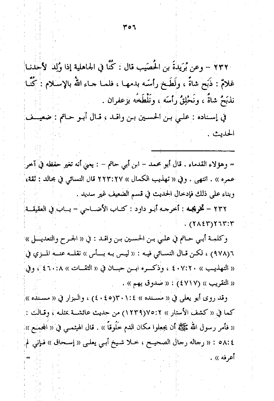 وكلمة أبي حاتم في علي بن الحسين بن واقد: في "الجرح والتعديل" 6 (978)، لكن قال النسائي فيه: "ليس به بأس" نقله عنه المزي في "التهذيب" 407: 20، وذكره ابن حبان في "الثقات" 8: 460، وفي "التقريب" (4717): "صدوق يهم".