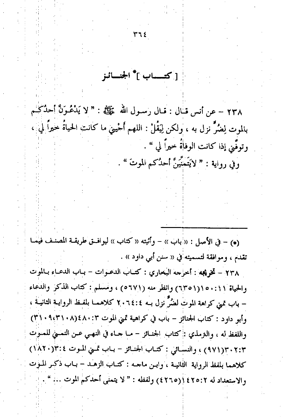 238 - عن أنس قال: قال رسول الله - صلى الله عليه وسلم -: "لا يَدْعُونَّ أحدُكم بالموت لِضُرٍّ نزل به، ولكن ليقل: اللهم أحْيني ما كانت الحياةُ خيرًا لي، وتوفني إذا كانت الوفاةُ خيرًا لي".