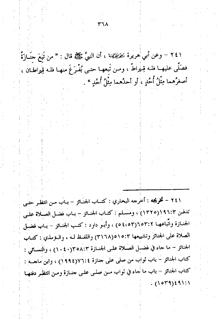 241 - وعن أبي هريرة - رضي الله عنه -، أن النبيَّ - صلى الله عليه وسلم - قال: "من تَبِعَ جِنَازَةً فصَلَّى عليها فله قِيراطٌ, ومن تَبِعها حتى يُفْرَغَ منها فله قِيراطان، أصغرُهما مِثْلُ أُحُدٍ، أو أحدُهما مِثْلُ أُحُدٍ".