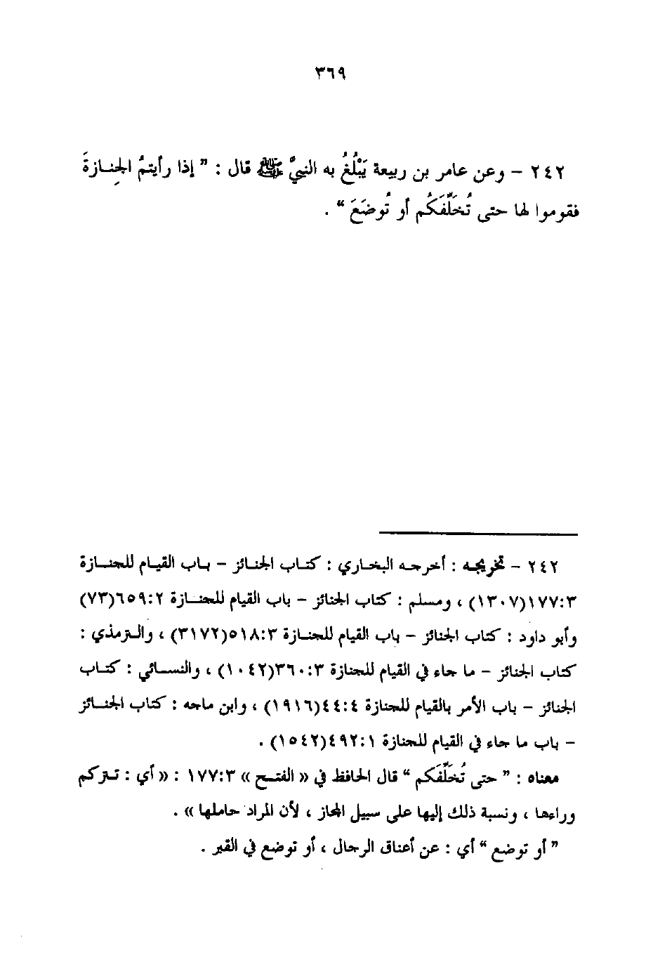 242 - وعن عامر بن ربيعة يَبْلُغُ به النبيَّ - صلى الله عليه وسلم - قال: "إذا رأيتمُ الجِنازةَ فقوموا لها حتى تُخَلِّفَكُم أو تُوضَعَ".