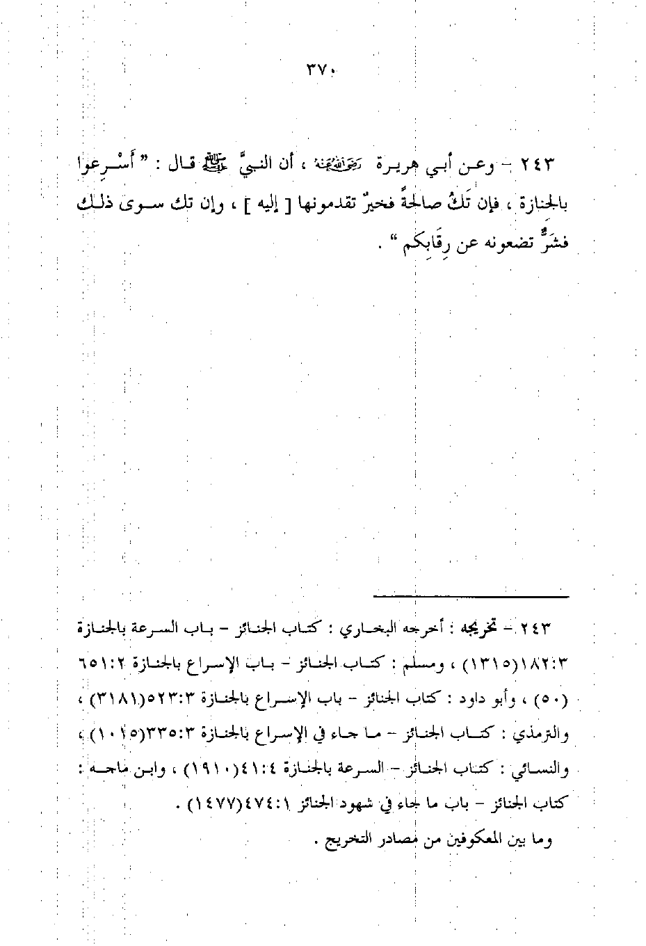 243 - تخريجه: أخرجه البخاري: كتاب الجنائز - باب السرعة بالجنازة 3: 182 (1315)، ومسلم: كتاب الجنائز - باب الإسراع بالجنازة 2: 651 (50)، وأبو داود: كتاب الجنائز - باب الإسراع بالجنازة 3: 352 (3181) , والترمذي: كتاب الجنائز - ما جاء في الإسراع بالجنازة 3: 335 (1015)، والنسائي: كتاب الجنائز - السرعة بالجنازة 4: 41 (1910)، وابن ماجه: كتاب الجنائز - باب ما جاء في شهود الجنائز 1: 474 (1477).