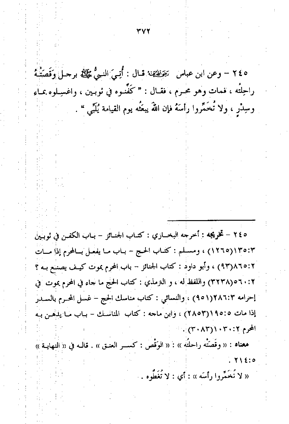 245 - وعن ابن عباس - رضي الله عنه - قال: أُتِيَ النبيُّ - صلى الله عليه وسلم - برجل وَقَصَتْهُ راحِلتُه، فمات وهو محرم، فقال: "كَفِّنوه في ثوبين، واغسِلوه بماء وسِدْرٍ، ولا تُخَمِّروا رأسَهُ فإن الله يبعَثُه يوم القيامة يُلَبِّي".