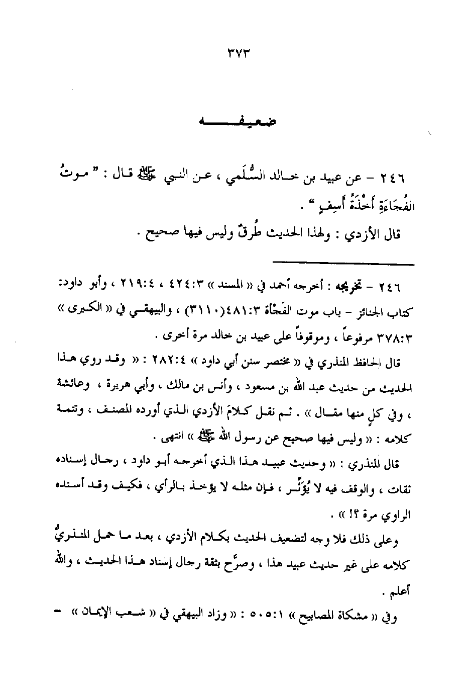 246 - تخريجه: أخرجه أحمد في "المسند" 3: 424، 4: 219، وأبو داود: كتاب الجنائز - باب موت الفجأة 3: 481 (3110)، والبيهقي في "الكبرى" 378: 3 مرفوعًا، وموقوفًا على عبيد بن خالد مرة أخرى.