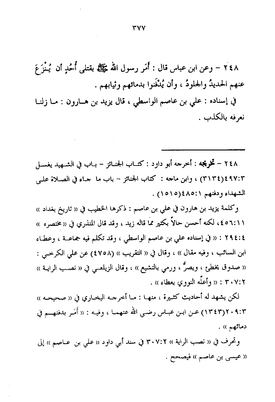 248 - تخريجه: أخرجه أبو داود: كتاب الجنائز - باب في الشهيد يغسل 497: 3 (3134)، وابن ماجه: كتاب الجنائز - باب ما جاء في الصلاة على الشهداء ودفنهم 1: 485 (1515).