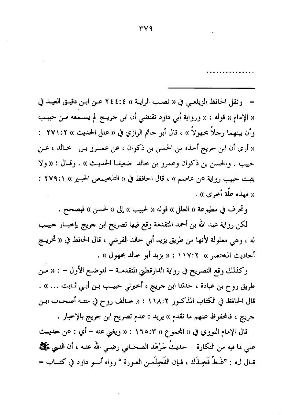 وكذلك وقع التصريح في رواية الدارقطني المتقدمة -الموضع الأول-: "من طريق روح بن عبادة، حدثنا ابن جريج، أخبرنى حبيب بن أبي ثابت. . . .". قال الحافظ في الكتاب المذكور 118: 2: "خالف روح في متنه أصحاب ابن جريج، فالمحفوظ عنهم ما تقدم" يريد: عدم تصريح ابن جريج بالإخبار.
