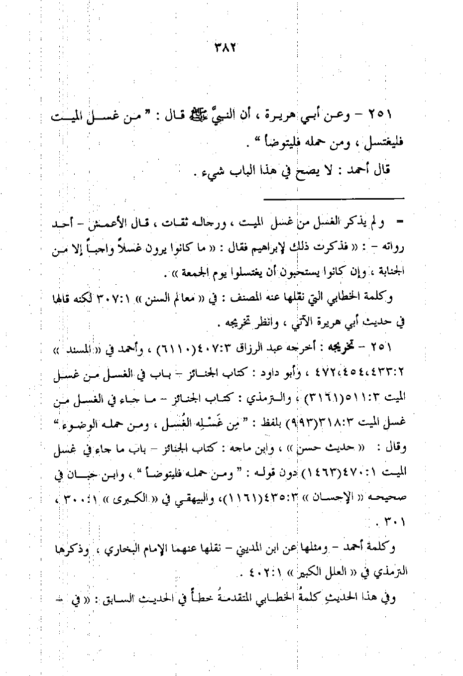 251 - تخريجه: أخرجه عبد الرزاق 3: 407 (6110)، وأحمد في "المسند" 2: 433، 454، 472، وأبو داود: كتاب الجنائز - ما في الغسل من غسل الميت 3: 511 (3161)، والترمذي: كتاب الجنائز - ما جاء في الغسل من غسل الميت 3: 318 (993) بلفظ: "مِن غَسْلِه الغُسل، ومن حمله الوضوء" وقال: "حديث حسن"، وابن ماجه: كتاب الجنائز - باب ما جاء في غسل الميت 1: 470 (1463) دون قوله: "ومن حمله فليتوضأ"، وابن حبَّان في صحيحه "الإحسان" 3: 435 (1161)، والبيهقي في "الكبرى" 1: 300، 301.