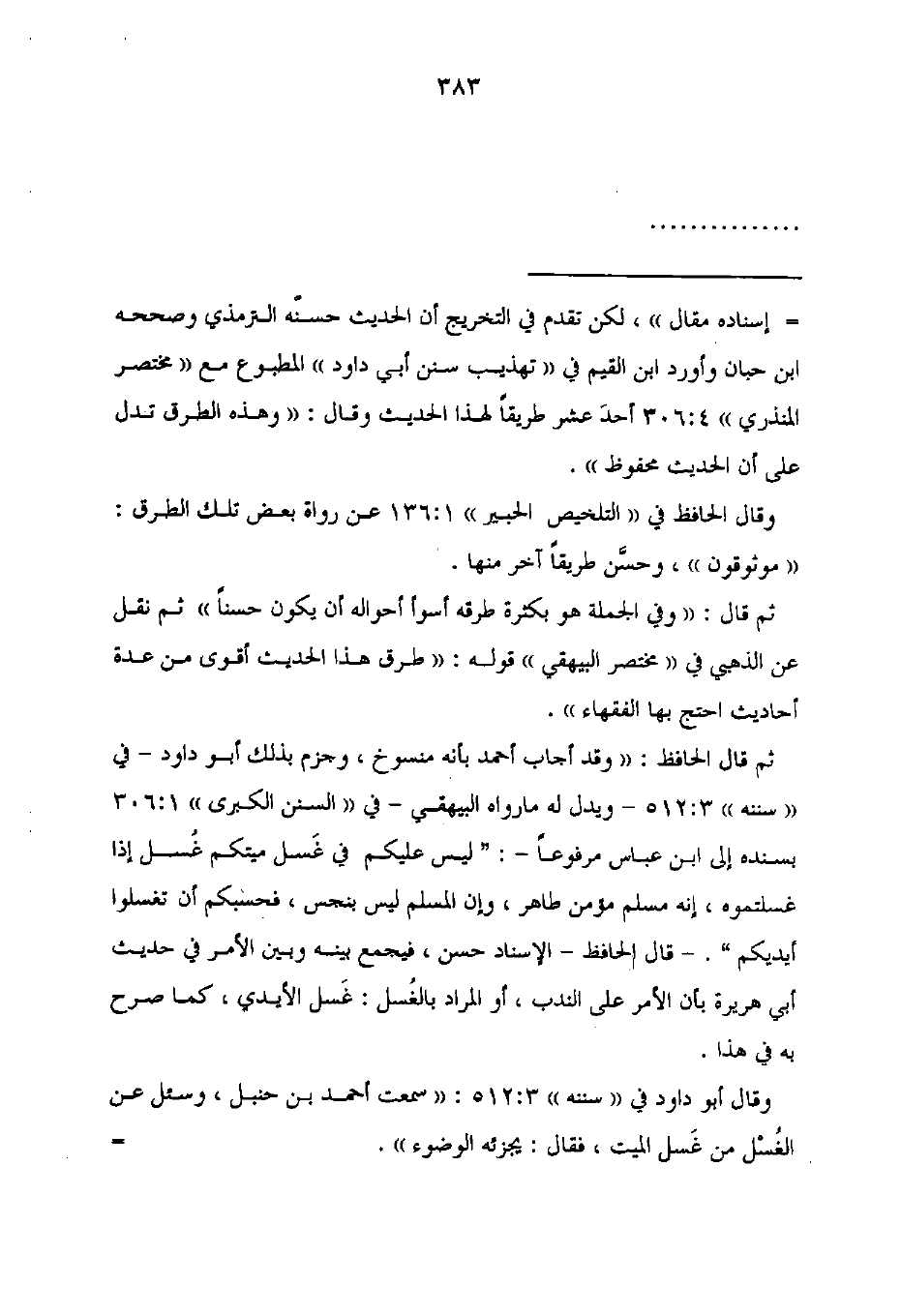 ثمَّ قال الحافظ: "وقد أجاب أحمد بأنّه منسوخ، وجزم بذلك أبو داود -في "سننه" 3: 512 - ويدل له ما رواه البيهقي -في "السنن الكبرى" 1: 306 بسنده إلى ابن عباس مرفوعًا-: "ليس عليكم في غَسل ميتكم غُسل إذا غسلتموه، إنه مسلم مؤمن طاهر، وإن المسلم ليس بنجس، فحسبكم أن تغسلوا أيديكم". -قال الحافظ- الإسناد حسن، فيجمع بينه وبين الأمر في حديث أبي هريرة بأن الأمر على الندب، أو المراد بالغُسل: غَسل الأيدي، كما صرح به في هذا.