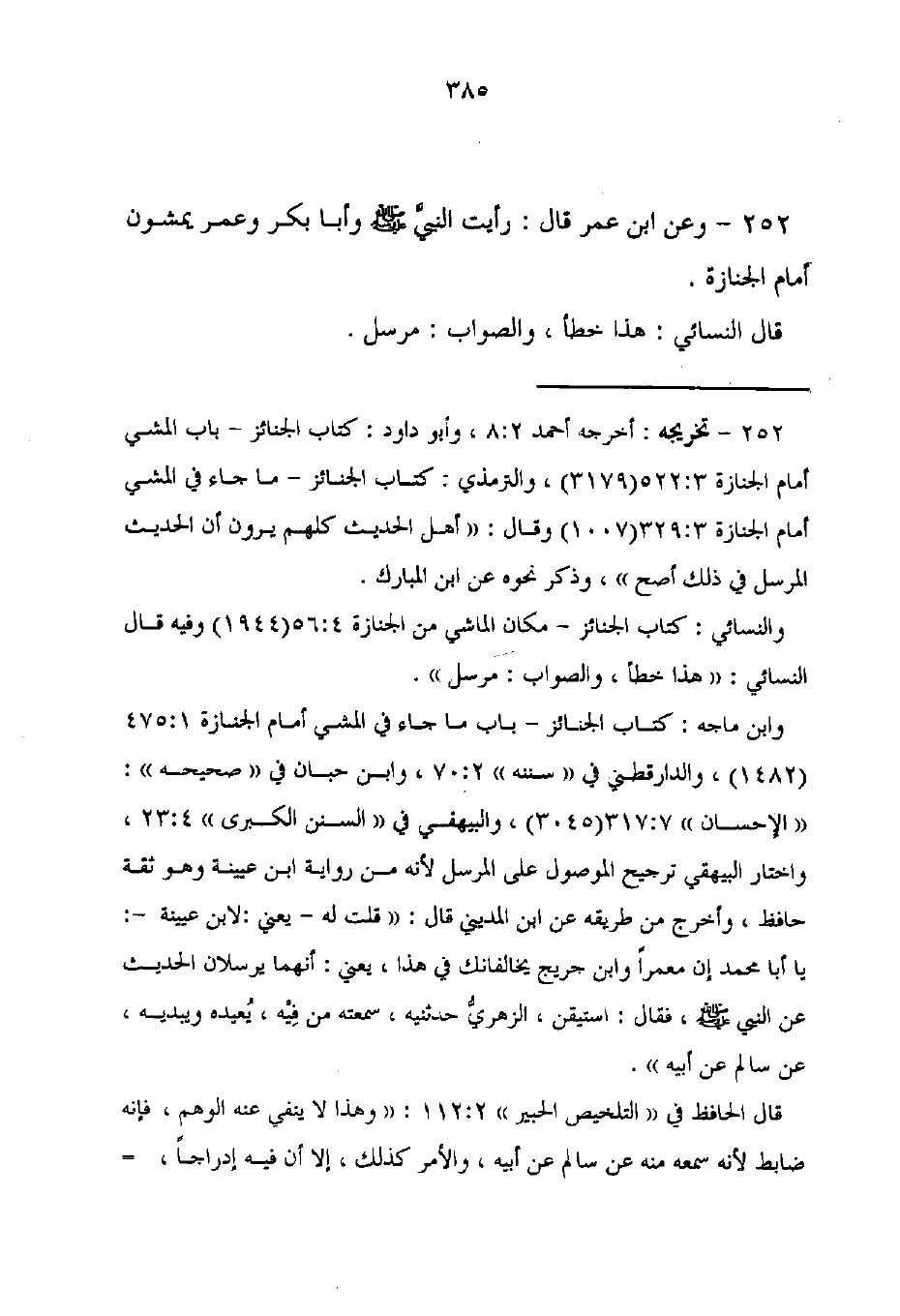 252 - تخريجه: أخرجه أحمد 2: 8، وأبو داود: كتاب الجنائز - باب المشي أمام الجنازة 3: 522 (3179)، والترمذي: كتاب الجنائز - ما جاء في المشي أمام الجنازة 3: 329 (1007) وقال: "أهل الحديث كلهم يرون أن الحديث المرسل في ذلك أصح"، وذكر نحوه عن ابن المبارك.