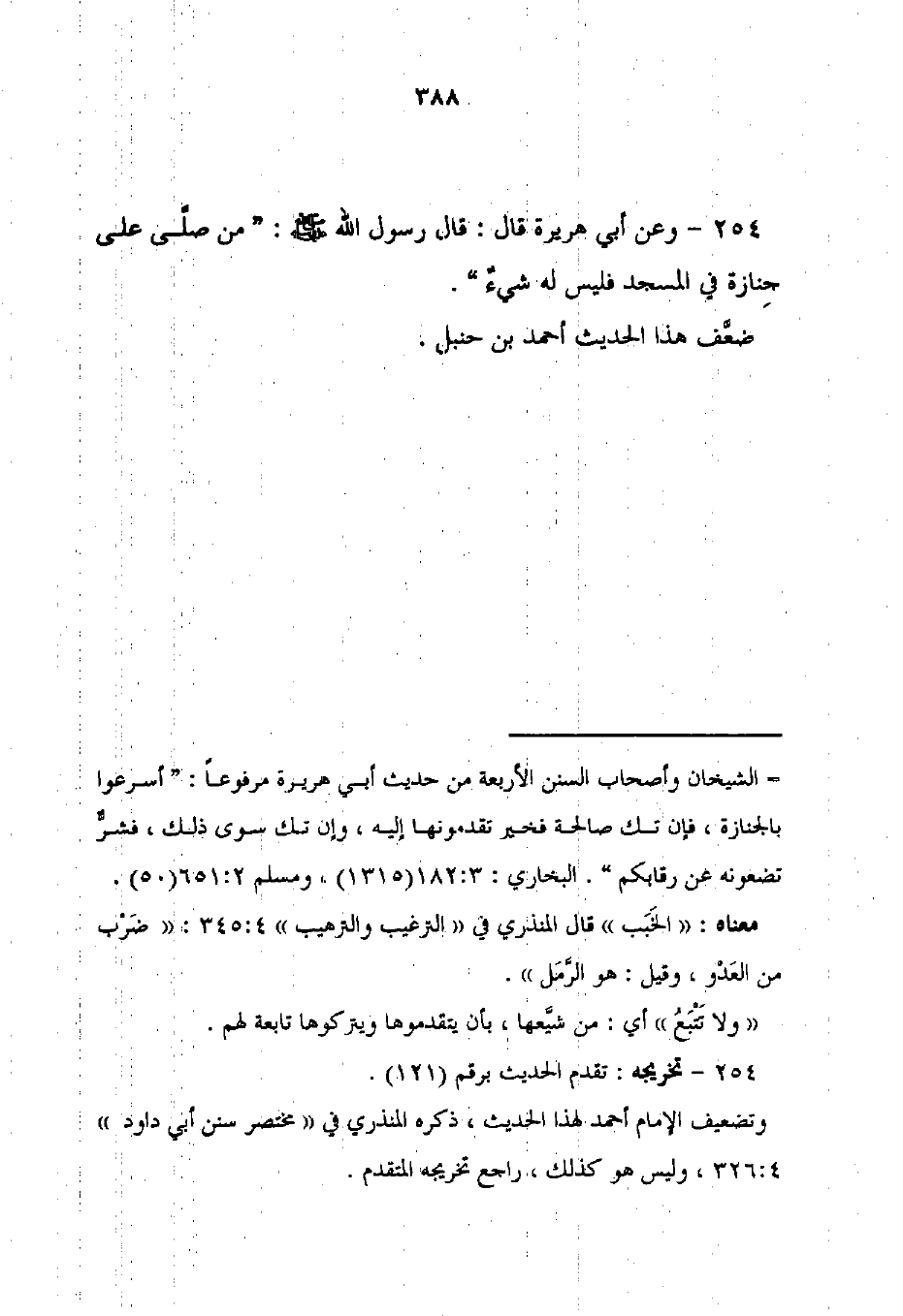 254 - وعن أبي هريرة قال: قال رسول الله - صلى الله عليه وسلم -: "من صلَّى على جنازة في المسجد فليس له شيءٌ".