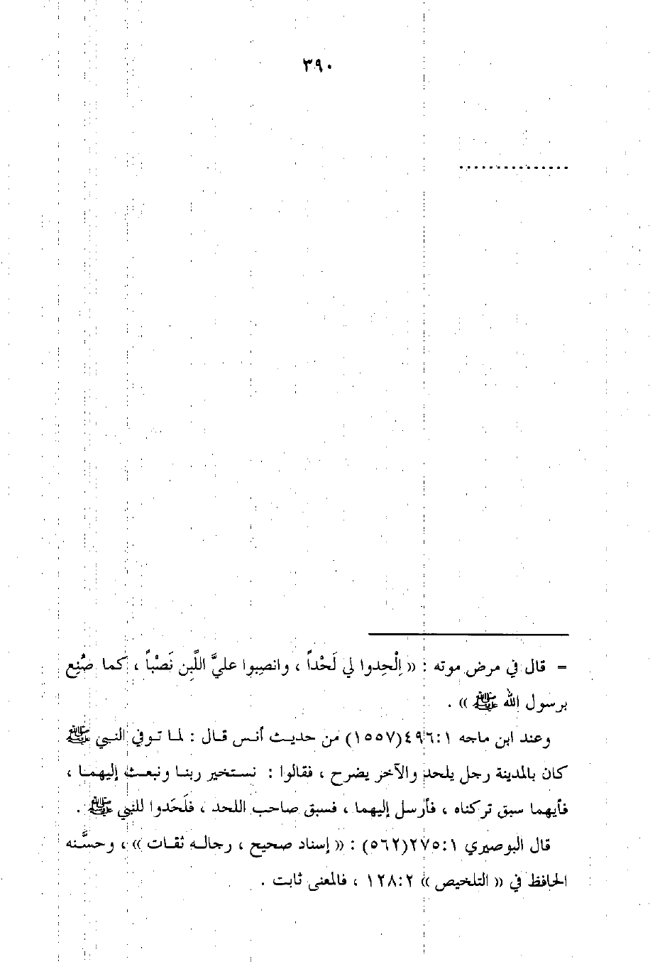 وعند ابن ماجه 1: 496 (1557) من حديث أنس قال: لما توفي النبي - صلى الله عليه وسلم - كان بالمدينة رجل يلحد والآخر يضرح، فقالوا: نستخير ربنا ونبعث إليهما، فأيهما سبق تركناه، فأرسل إليهما، فسبق صاحب اللحد، فلَحَدوا للنبي - صلى الله عليه وسلم -.