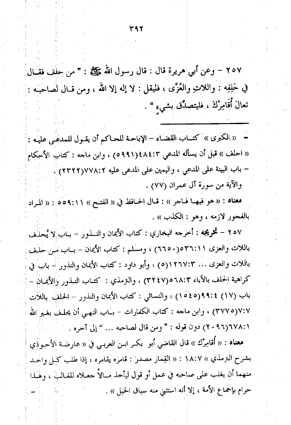 257 - وعن أبي هريرة قال: قال رسول الله - صلى الله عليه وسلم -: "من حلف فقال في حَلِفِه: واللاتِ والعُزَّى، فليقل: لا إله إلا الله، ومن قال لصاحبه: تعالَ أُقَامِرْكَ، فليتصدَّق بشيءٍ".