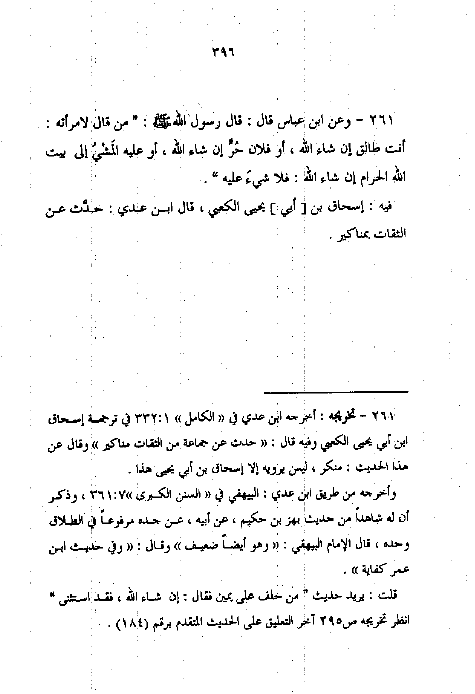 261 - وعن ابن عباس قال: قال رسول الله - صلى الله عليه وسلم -: "من قال لامرأته: أنت طالق إن شاء الله، أو فلان حُرٌّ إن شاء الله، أو عليه المَشْيُ إلى بيت الله الحرام إن شاء الله: فلا شيءَ عليه".