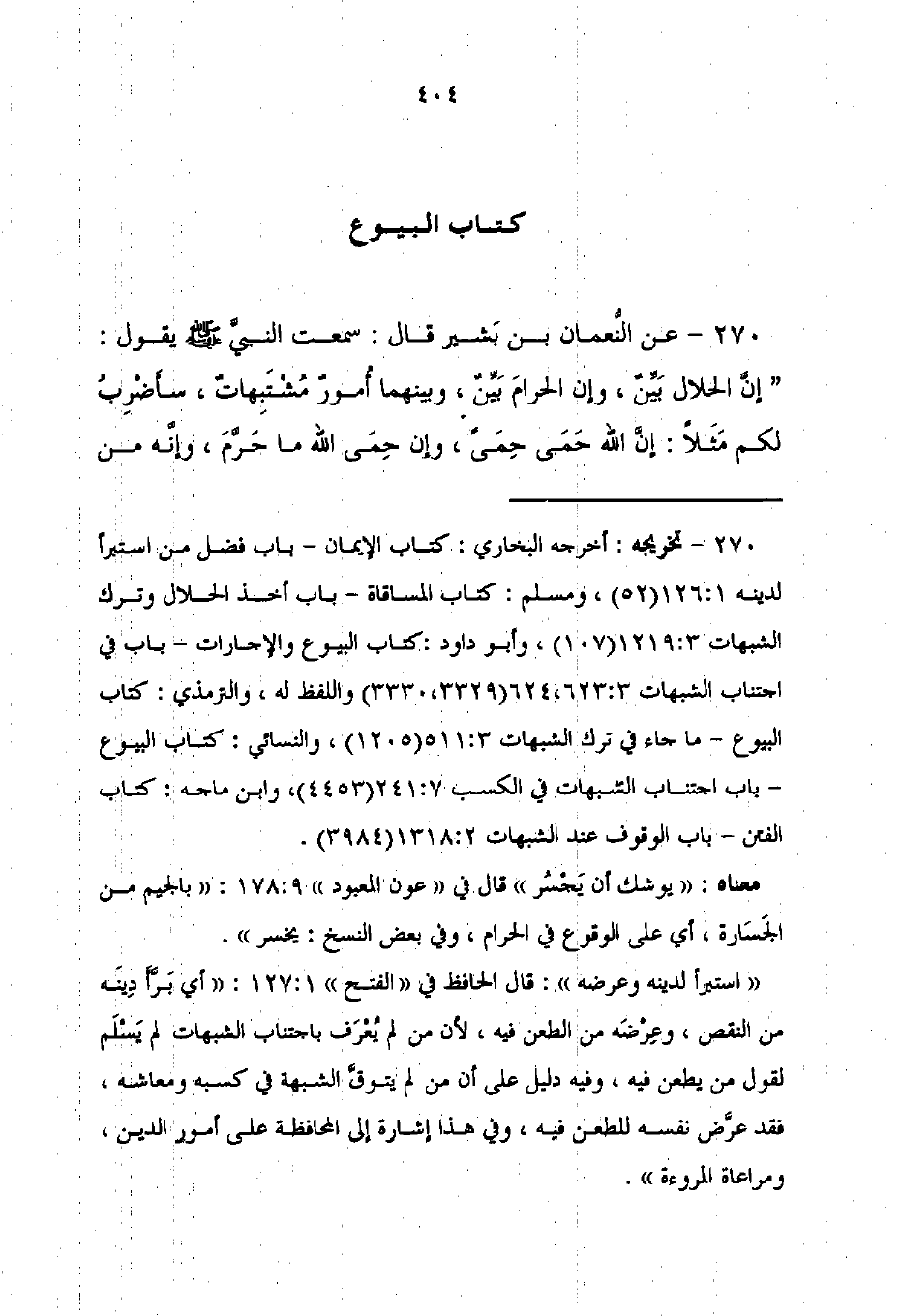 270 - تخريجه: أخرجه البخاري: كتاب الإيمان - باب فضل من استبرأ لدينه 1: 126 (52)، ومسلم: كتاب المساقاة - باب أخذ الحلال وترك الشبهات 3: 1219 (107)، وأبو داود: كتاب البيوع والإجارات - باب في اجتناب الشبهات 623: 3، 624 (3329، 3330) واللفظ له، والترمذي: كتاب البيوع - ما جاء في ترك الشبهات 3: 511 (1205)، والنسائي: كتاب البيوع - باب اجتناب الشبهات في الكسب 7: 241 (4453)، وابن ماجه: كتاب الفتن - باب الوقوف عند الشبهات 1318: 2 (3984).