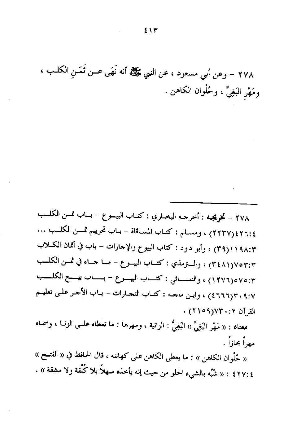 278 - تخريجه: أخرجه البخاري: كتاب البيوع - باب ثمن الكلب 426: 4 (2237)، ومسلم: كتاب المساقاة - باب تحريم ثمن الكلب ... 3: 1198 (39)، وأبو داود: كتاب البيوع والإجارات - باب في أثمان الكلاب 753: 3 (3481)، والترمذي: كتاب البيوع - ما جاء في ثمن الكلب 3: 575 (1276)، والنسائي: كتاب البيوع - باب بيع الكلب 7: 309 (4666)، وابن ماجه: كتاب التجارات - باب الأجر على تعليم القرآن 2: 730 (2159).